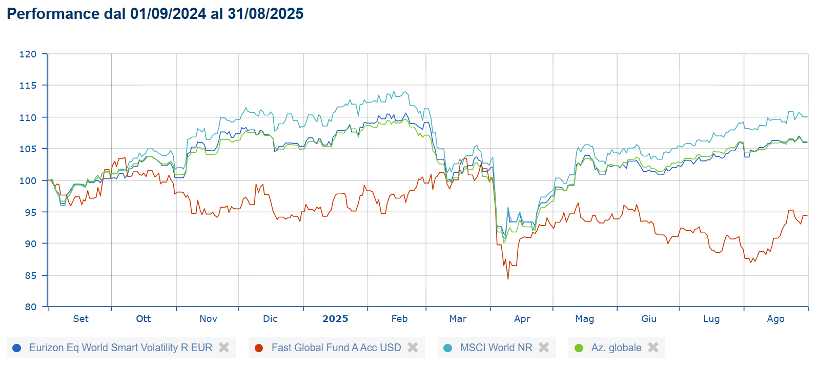 * La metodologia utilizzata per l'elaborazione dei dati è interna a Quantalys. I calcoli sono aggiornati al 31/08/2025. I calcoli sono effettuati da Quantalys e sono basati sui dati inviati giornalmente dalle società di gestione. Eventuali errori o omissioni sono di esclusiva responsabilità di Quantalys. Nonostante la massima cura prestata nella raccolta, nella verifica e nell’elaborazione dei dati provenienti da fonti ritenute affidabili, Quantalys non garantisce che i dati ricevuti siano accurati. Tutti i calcoli sono effettuati in euro.