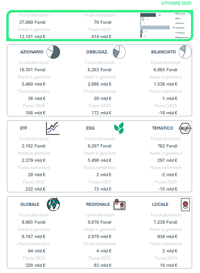 27.080 fondi distribuiti in Europa per un totale di 12.101 miliardi di Euro di masse gestite, scopri l'analisi mensile di ottobre 2025 sull'andamento della Raccolta in Europa!