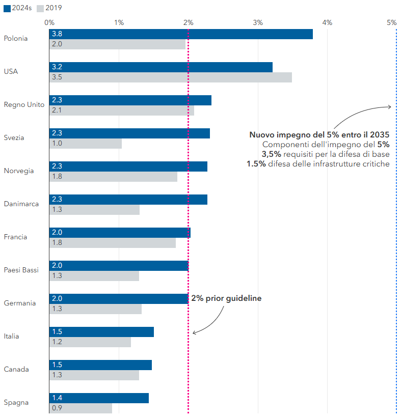 Fonti: Capital Group, NATO. I dati relativi al 2024 sono stime basate sui dati più recenti disponibili, al 28 agosto 2025. Il nuovo impegno del 5% è stato annunciato il 27 giugno 2025. La percentuale del PIL è basata su prezzi e tassi di cambio costanti, indicizzati al 2021. La NATO definisce la spesa per la difesa come i pagamenti effettuati da un governo nazionale specificamente per soddisfare le esigenze delle proprie forze armate, di quelle degli Alleati o dell'Alleanza. La difesa delle infrastrutture critiche consiste in investimenti volti a proteggere le infrastrutture critiche, difendere le reti, finanziare l'innovazione e rafforzare la base industriale della difesa.
