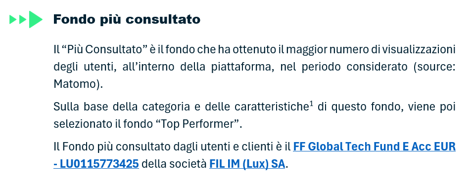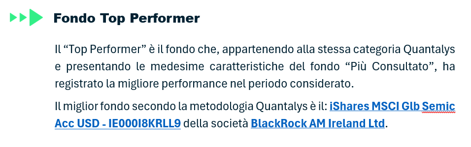 Scopri le schede Quantalys del fondo “Più Consultato” e del fondo “Top Performer”, appartenente alla stessa categoria Quantalys di ottobre 2025.