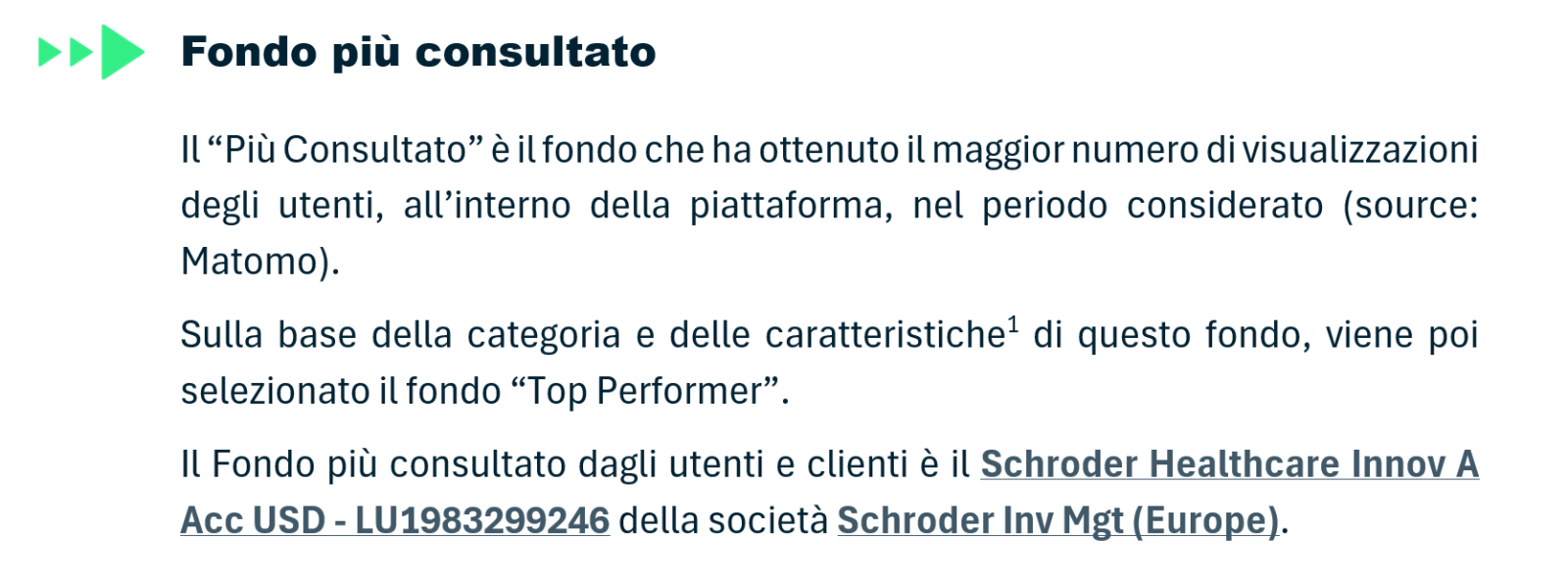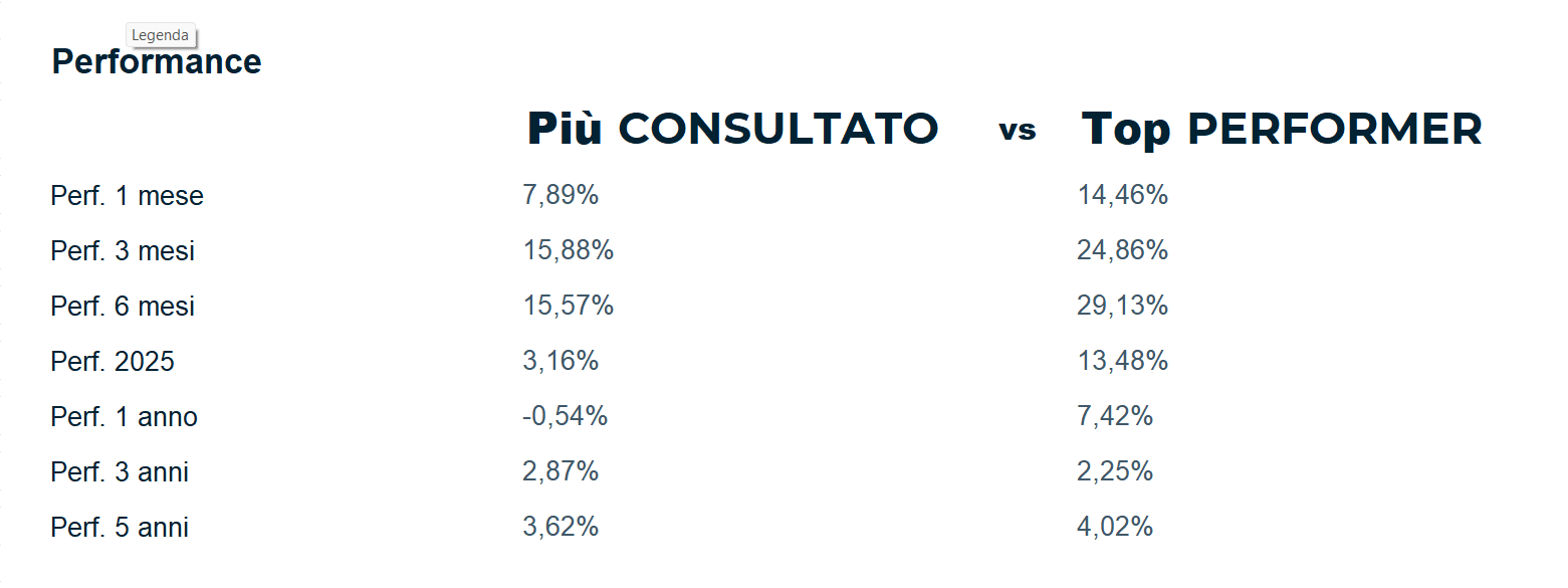 Scopri le schede Quantalys del fondo “Più Consultato” e del fondo “Top Performer”, appartenente alla stessa categoria Quantalys di dicembre 2025.