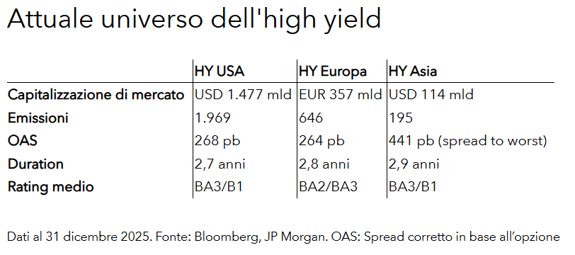 Il mercato high yield statunitense rimane il punto di riferimento per gli investitori globali grazie alle sue dimensioni, alla sua profondità e alla diversità dei suoi partecipanti. Questo ecosistema garantisce una liquidità affidabile e una determinazione dei prezzi più efficiente, soprattutto in periodi di stress, distinguendosi dai mercati europei e asiatici, strutturalmente meno profondi.