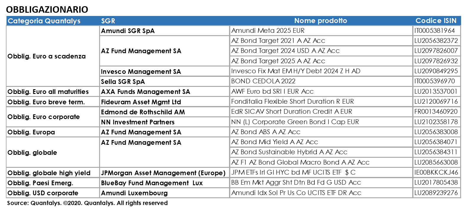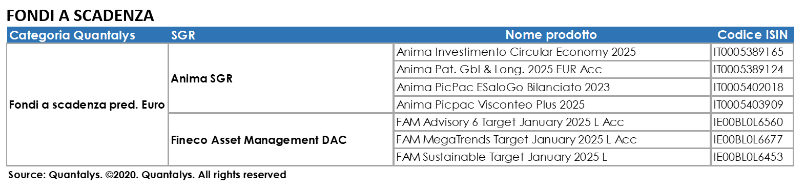 Guardando ai comparti registriamo l’ingresso di 22 nuovi fondi nel comparto Azionario con il numero maggiore nell’Azionario Globale e nell’Azionario Settoriale dove, in entrambi i casi, sono stati lanciati 9 nuovi prodotti; 17 nuovi fondi nel comparto Obbligazionario con il numero maggiore, pari a 10, nella categoria Obbligazionario Euro; 11 nuovi fondi nel comparto Bilanciati e Flessibili; 7 nuovi prodotti tra i fondi a scadenza e 6 nel comparto Performance Assoluta.