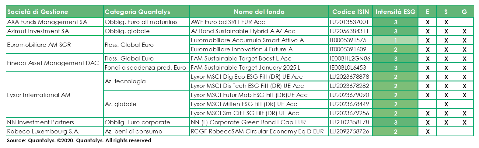 NUOVI FONDI ESG:  Axa, Azimut, Euromobiliare, Fineco, Lyxor, NN Investment e Robeco hanno lanciato, negli ultimi mesi, 13 nuovi fondi ESG