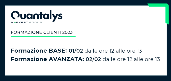 Il Team di Quantalys organizza dei corsi di formazione, BASE ed AVANZATO, rivolti a tutti i nostri clienti per supportarvi nell'utilizzo degli strumenti e tool della piattaforma.