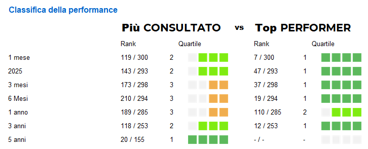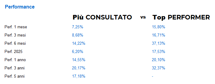 Scopri le schede Quantalys del fondo “Più Consultato” e del fondo “Top Performer”, appartenente alla stessa categoria Quantalys di ottobre 2025.