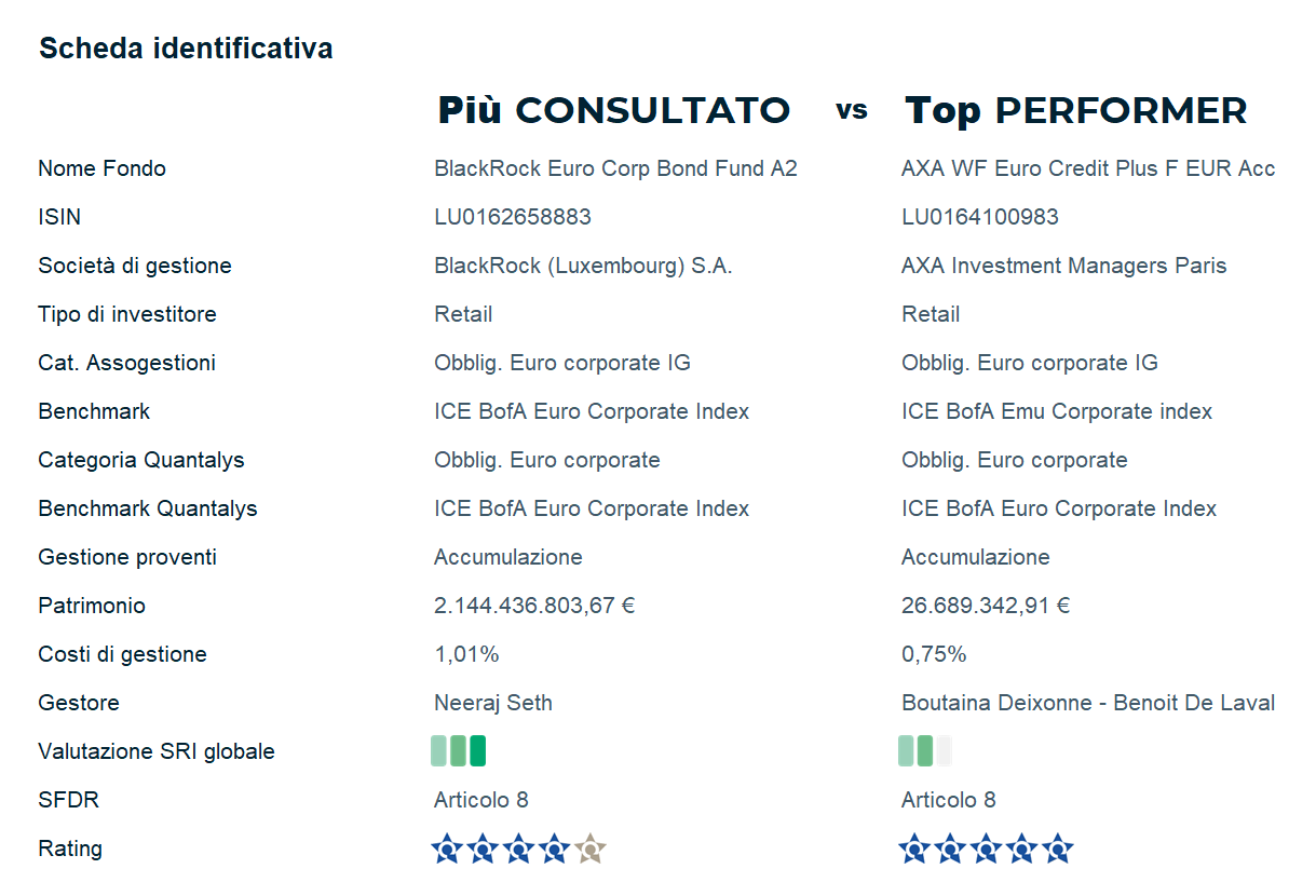 Scopri le schede Quantalys del fondo “Più Consultato” e del fondo “Top Performer”, appartenente alla stessa categoria Quantalys di novembre 2025.