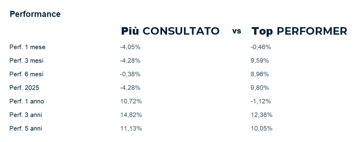 Scopri le schede Quantalys del fondo “Più Consultato” e del fondo “Top Performer”, appartenente alla stessa categoria Quantalys di aprile 2026.